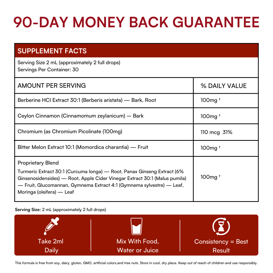 Crafted with Berberine, Ceylon Cinnamon, Chromium, Bitter Melon, and Apple Cider Vinegar. Ingredients clinically shown to lower blood sugar, improve insulin sensitivity, and support metabolic health. Pure plant extracts, no fillers, no artificial additives. Just nature's most powerful compounds working together.